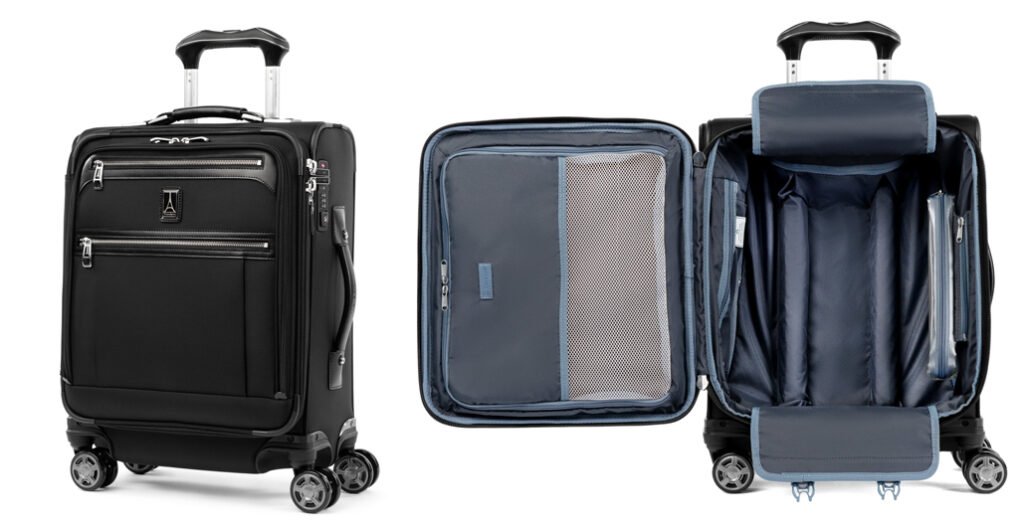 De Platinum® 55cm Slim is de ideale metgezel voor de veeleisende reiziger. Met hoogwaardige stoffen die bestand zijn tegen vlekken, echt leer en chromen ritssluitingen straalt de koffer luxe uit. Je kan de koffer tot 2 cm uitbreiden voor extra opbergruimte, terwijl een ingebouwde USB-poort en powerbankvak ervoor zorgen dat je altijd verbonden blijft tijdens je reis.